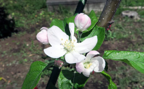 2026年4月8日 りんごの木、メイちゃんの瞳には赤い蕾と花が成っている。アルプス乙女にはたくさんの白い花が咲いている。 植えて初めて、百年ふじにうすいピンク色の蕾と花が成っている。 綿棒で受粉をしていると、アルプス乙女...